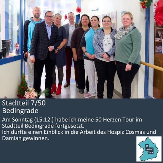 Das Hospiz Cosmas und Damian in Bedingrade ist ein Ort voller Mitmenschlichkeit, Fürsorge und Würde. Am Sonntag (15.12.) hatte ich im Rahmen meiner 50 Herzen Tour die Gelegenheit, den Hospizdienst zu besuchen.