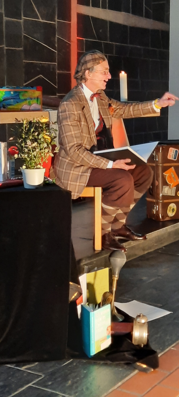 Eine Wanderung der ganz besonderen Art erlebten das Publikum mit dem Künstler Christoph Gilsbach als „Heribert der Wanderer". Mit seiner Erzählkunst machte sich der Wanderer literarisch und pantomimisch auf einen gedanklichen Wanderweg durch Erinnerungen und Lebensgeschichten. Er schaffte einen Bogen aus Vergangenheit, Gegenwart und Zukunft - vom Frühling als Lebensbeginn bis zur letzten Lebensphase eines Menschen. Einfühlsam zeichnete Heribert einen Weg der Geschichte rund um den Themenkreis Sterben, Tod und Trauer in dem die Lebensgeschichten und das Glück des Augenblicks die zentrale Rolle spielten. Begleitet wurde Christoph Gilsbach musikalisch von dem Saxophonisten Frank Lienemann, der in beeindruckender Weise die Geschichten zu einem einzigartigen Erlebnis machte.