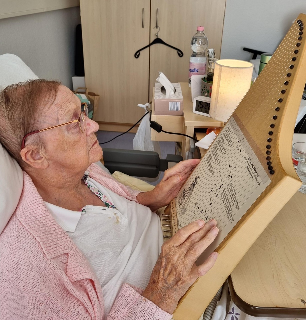 Mit großer Begeisterung hat Frau R. gemeinsam mit unserer Begleiterin Michaela Cornelißen vom Ambulanten Hospizdienst die Veeh-Harfe entdeckt und sich an das „Steiger-Lied" gewagt.