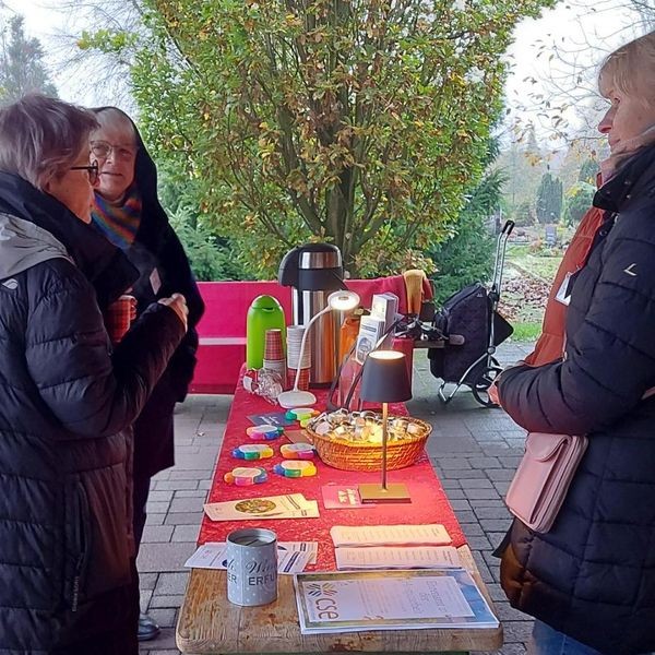 Am 1. November haben wir zu einer besonderen Aktion der Trauerbegleiter/innen auf dem Friedhof in der Pflanzstraße eingeladen und haben Botschaften der Hoffnung und des Trostes verteilt. Es war ein wunderschöner Tag, geprägt von vielen besonderen Begegnungen und herzlichen Gesprächen. Zahlreiche Besucher nahmen die Gelegenheit wahr, innezuhalten und Trost zu finden – ein Moment der Verbundenheit und des Mitgefühls, der alle Beteiligten berührt hat.