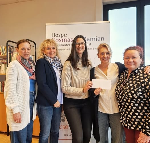 Foto CSE gGmbH: Links das Team des ambulanten Hospizdienstes, rechts Nicole Louven (Dozentin) und Svetlana Behring (kaufmännische Geschäftsführerin) von der Pflegeakademie WBL Bottrop.