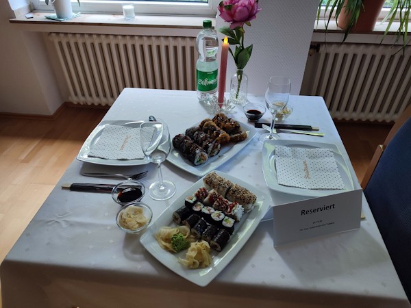 Die eine Kollegin bügelt die weiße Tischdecke und deckt den Tisch besonders liebevoll, die andere Kollegin kauft das Sushi ein und trifft sich mit unserem Gast zu einem schönen Candle-Light-Dinner zum Sushi-Date. Ein Abend, der allen Beteiligten viel Freude bereitet.