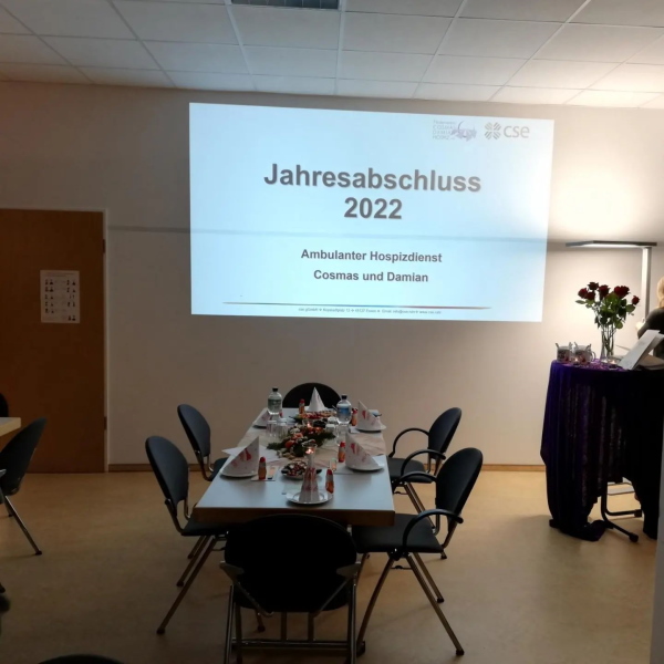 Knapp 40 Ehrenamtliche nahmen teil und kamen endlich mal wieder ins Gespräch. Ein bebilderter Rückblick über das Jahr zeigte die vielfältigen Aktivitäten unseres Hospizdienstes. Ob Valentinsengel im Hospiz, Info- und Mitmachstände in Borbeck und Umgebung, „Letzte Hilfe"-Kurse, Trauercafés oder Basare der Kreativen Könner – ohne Ehrenamtliche Unterstützung wäre vieles nur halb so erfolgreich, lebendig und freudvoll gelaufen.