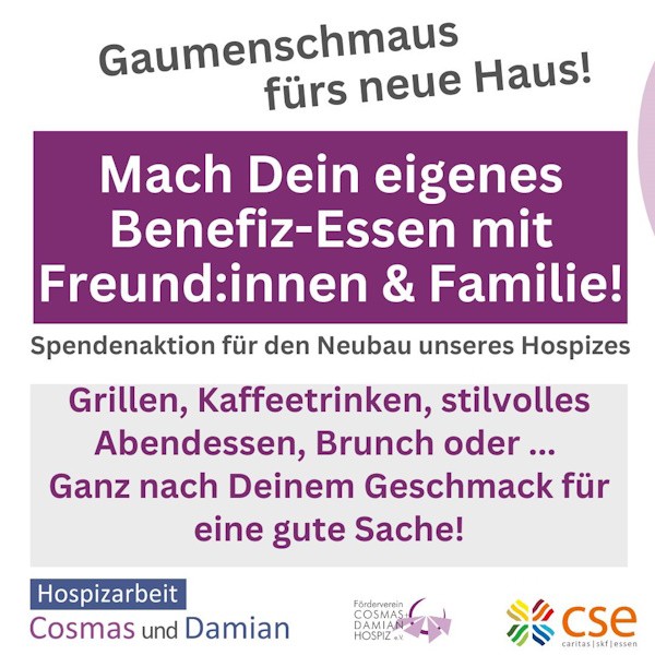 Veranstaltet Euer eigenes Benefiz-Essen & unterstützt den Neubau des Hospizes Cosmas und Damian. Ob Grillen, Kaffeetrinken, stilvolles Abendessen, Brunch oder oder oder... ganz nach Eurem Geschmack! ☕🎂🍗🍔🍅🥦🥨🥢🍽