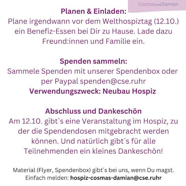 - Am 12. Oktober feiern wir den Abschluss der Aktion mit „Würstchen im Brötchen" im Hospiz Cosmas und Damian, (Laarmannstr. 14) – Seid dabei! Dort könnt Ihr auch die Spendenboxen abgeben und erhaltet ein kleines Dankeschön.
